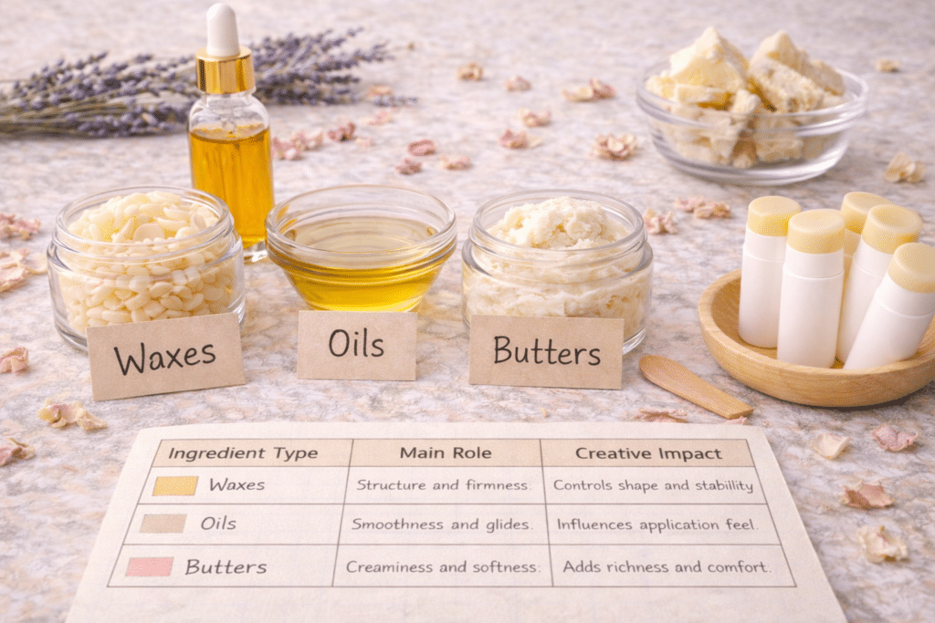 Rather than focusing on outcomes or results, understanding why certain ingredients are commonly used can help makers feel more confident when exploring small-batch lip balm projects. Each ingredient plays a specific role in how a lip balm looks, feels, and performs during everyday use.