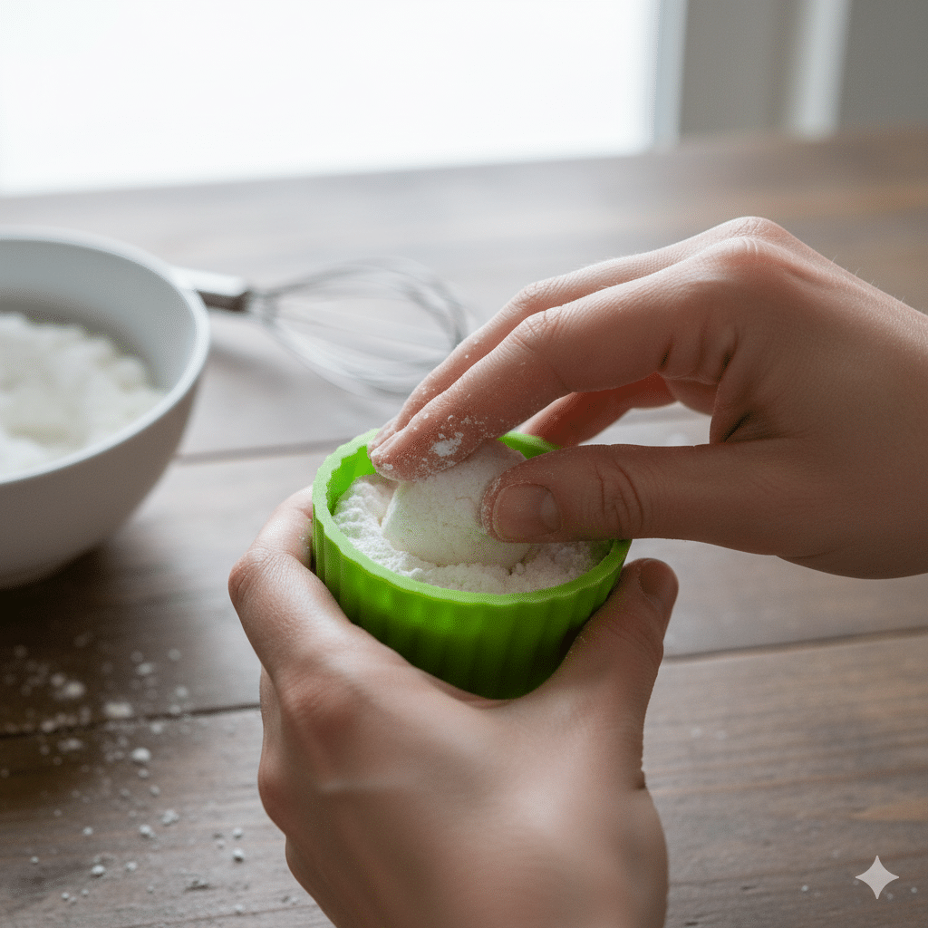 - **Moisten & Mold:** Using a spray bottle, spritz the mixture with water or witch hazel, stirring quickly after each spritz. Stop immediately once the mixture holds its shape when squeezed—it should feel like slightly damp sand. Press the mixture *firmly* into your silicone or plastic molds.