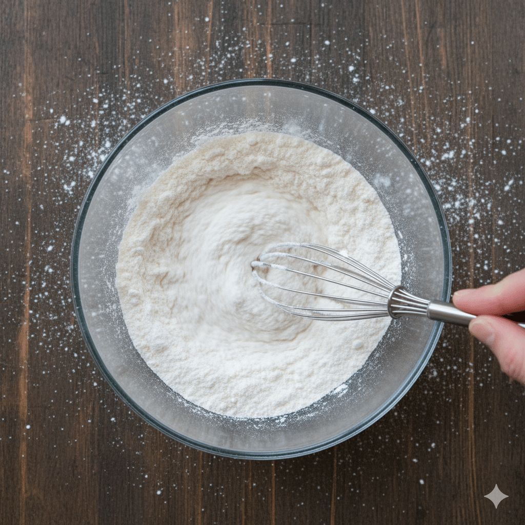 A whisk is used to mix the ingredients thoroughly and ensure that there are no clumps in the mixture. A small whisk or fork can be used for this purpose.